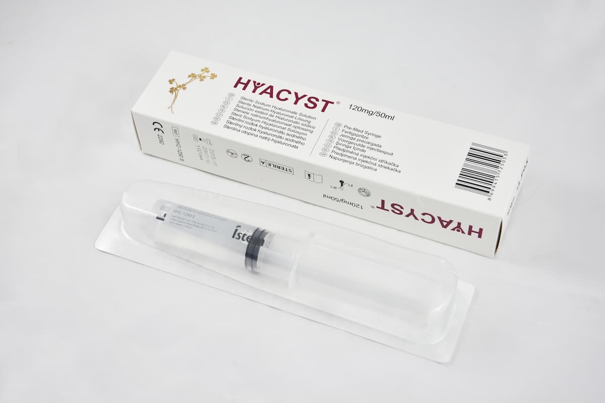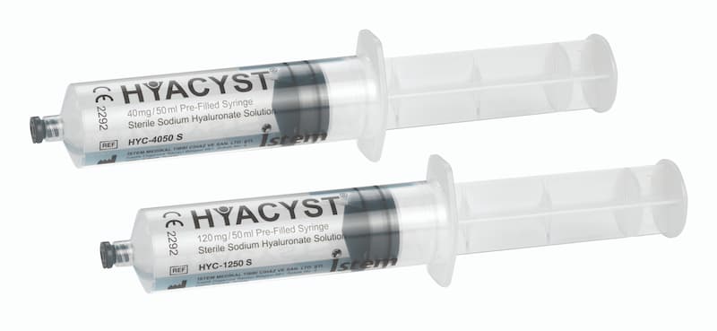 Hyacyst® (sodium hyaluronate) is available in strengths of 40mg/50ml and 120mg/50ml which are supplied as Pre-Filled Syringes (PFS).